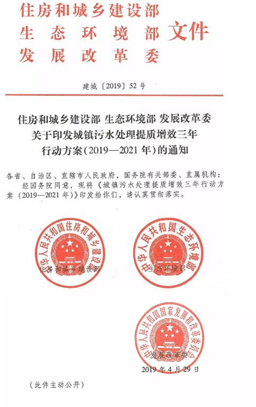 為貫徹落實全國生態(tài)環(huán)境保護大會、中央經濟工作會議精神和《政府工作報告》部署要求,加快補齊城鎮(zhèn)污水收集和處理設施短板,盡快實現污水管網全覆蓋、全收集、全處理,經國務院同意,住房和城鄉(xiāng)建設部、生態(tài)環(huán)境部、發(fā)展改革委印發(fā)《城鎮(zhèn)污水處理提質增效三年行動方案(2019-2021年)》(建城〔2019〕52號,2019年4月29日)。