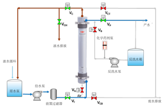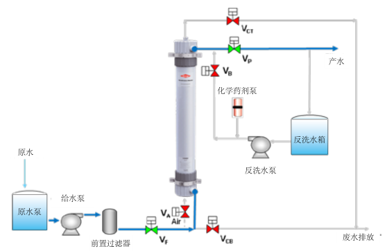 濃水排放過濾和錯流過濾模式操作同樣需要定時氣擦洗、水反洗和正洗以及定期的化學清洗來恢復(fù)超濾膜過濾性能。
